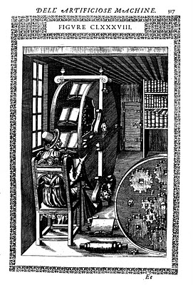 Tout ce qu’il faut savoir sur cet étrange objet est à lire dans ce billet du blog du bibliophile. Du point de vue cognitif, ou si l’on préfère, du point de vue de l’histoire des supports d’inscription de la connaissance, la roue à livres arrive à un moment où il devient essentiel de pouvoir mettre les textes en résonance, de les comparer, un moment où il est également nécessaire de pouvoir lire plusieurs ouvrages simultanément pour faire le tour (de roue) d’un sujet, d’un domaine, d’une question. Bref, la roue à livres incarne davantage qu’elle n’inaugure le modèle de la bibliothèque d’étude.