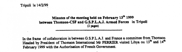 Les procès-verbaux de réunions que nous avons obtenus décrivent pourtant des discussions secrètes tenues les 13 et 14 février 1999, à Tripoli, entre les représentants du groupe d’armement français Thales (dénommée Thomson-CSF à cette époque) et l’état-major militaire du Colonel Kadhafi.