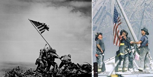 La photo "Raising the Flag on Iwo Jima" (image de gauche), par Joe Rosenthal a été reprise et pastichée très souvent dans des fictions, sur des couvertures de comic-books ou même dans le "monde réel".