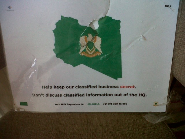 Un tout petit logo (ci-contre), une tâche quasi-invisible en haut à gauche d’une affichette (ci-dessous) placardée dans le centre de commandement de l’unité électronique de Mouammar Kadhafi, à Tripoli. Ce logo, c’est en réalité celui de l’entreprise française Amesys, fournisseur de matériel de surveillance très sensible à la dictature libyenne entre 2007 et 2009 – OWNI vous en parlait dès le mois de juin. Ce cliché nous a été gracieusement fourni par le Wall Street Journal, après la publication d’une enquête aux conclusions sévères, dans l’édition du 30 août du quotidien financier.