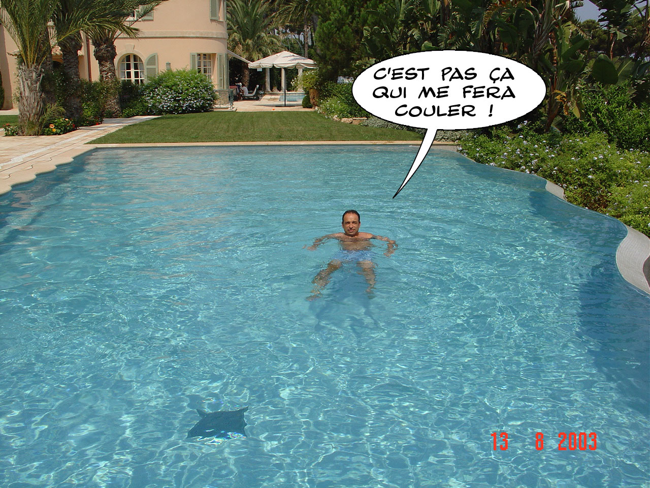 Certains hommes politiques français baignent dans le liquide, nous dit cette image sur un mode allégorique. Le pauvre Copé, qui a bien le droit de se baigner dans une piscine en plein été, se retrouve ainsi comme un gardon pris dans le vivier d’un pêcheur de gros. Il illustre une situation qui se fait jour sans le savoir. Il offre aux spectateurs qui se sont invités, par voie de presse, dans l’intimité qu’il entretient avec celui qui le photographie, une magnifique illustration des contacts “inappropriés” (pour reprendre cet anglicisme clintonien remis à la mode par DSK) entre les hommes politiques flirtant avec les sommets de l’Etat et les eaux claires mais troubles de la finance internationale. A tort ou à raison, on le saura peut-être un jour.