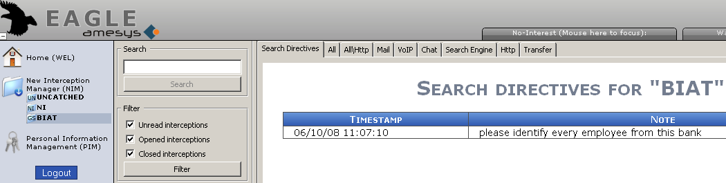 En outre, d’autres captures d’écran du système Eagle révèle que ses utilisateurs ont également cherché à identifier “tous les employés” d’une banque tunisienne, qu’on y trouve ainsi des dizaines d’adresses mail et de courriels échangés par plusieurs de ses employés (essentiellement des femmes), ainsi que des reçus envoyés automatiquement par les robots de la banque, ou encore par le système SWFIT de transferts interbancaires… que l’on pourrait difficilement suspecter de pédophilie.