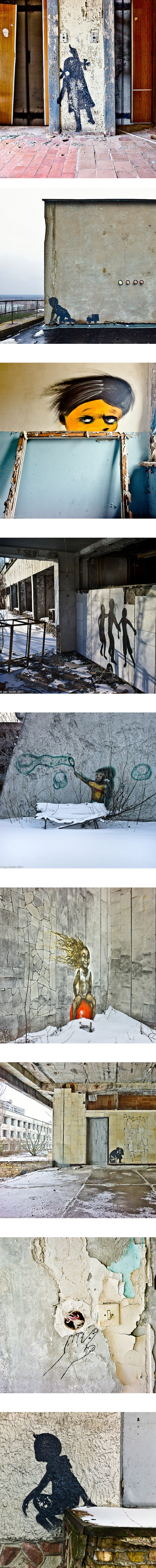 Toujours cette semaine a été mis en avant le travail du photographe Jan Smith qui présente cette série de photos magnifiquement envoûtantes qu’il est allé faire à Tchernobyl. Il a été exactement 26 ans après l’accident nucléaire catastrophique survenu dans la ville ukrainienne, la ville est restée aujourd’hui inhabitée…sauf pour un petit nombre de personnes. Jan Smith a donc décidé de photographier les graffitis de la ville. Il raconte qu’il a ainsi commencé son travail à Pripiat (la ville évacuée après la catastrophe de Tchernobyl) et a été immédiatement attiré par ces graffitis et ce mélange de nostalgie, d’innocence, d’humour dans cet endroit isolé. Certains graffitis sont grands et mis en évidence mais beaucoup sont de petite taille et les trouver était pour Jan Smith, une sorte de quête.